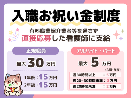 有料職業紹介業者等を通さず自身が直接応募し、正規職員として採用された職員について、「入職お祝い金制度」として、以下の条件により「入職お祝い金」を支給します。